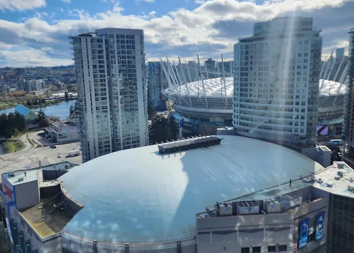 **Welcome to the Modern High-Rise 1 Bedroom Condo With Water View Near Stadiums**, an urban oasis nestled in the vibrant heart of Downtown Vancouver. This contemporary retreat offers breathtaking views of the waterfront, providing a tranquil escape while being conveniently located near the city's bustling financial and commercial districts. Perfect for business travelers and leisure seekers alike, the condo boasts an enviable proximity to renowned stadiums and cultural attractions.